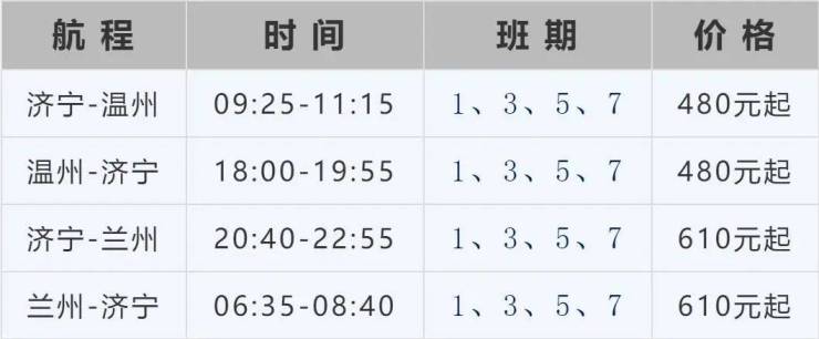 为更好地给旅客提供优质便捷的航空出行服务,8月15日起,济宁机场将开通直飞温州、兰州航班,由青岛航空执飞,班期为每周1、3、5、7,机型为A320,开航前三班特价机票!