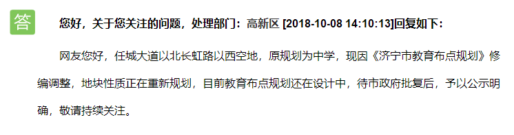 任城大道北长虹路西这块空地:任城大道以北长虹路以西空地,原规划为中学,现因《济宁市教育布点规划》修编调整,地块性质正在重新规划,目前教育布点规划还在设计中,待市政府批复后,予以公示明确,敬请持续关注。