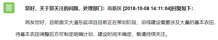 崇文大道东延项目:目前崇文大道东延项目目前正在策划阶段,沿线建设需要涉及大量的基本农田,待基本农田调整后方可制定明确计划,建设时间未确定,敬请持续关注。