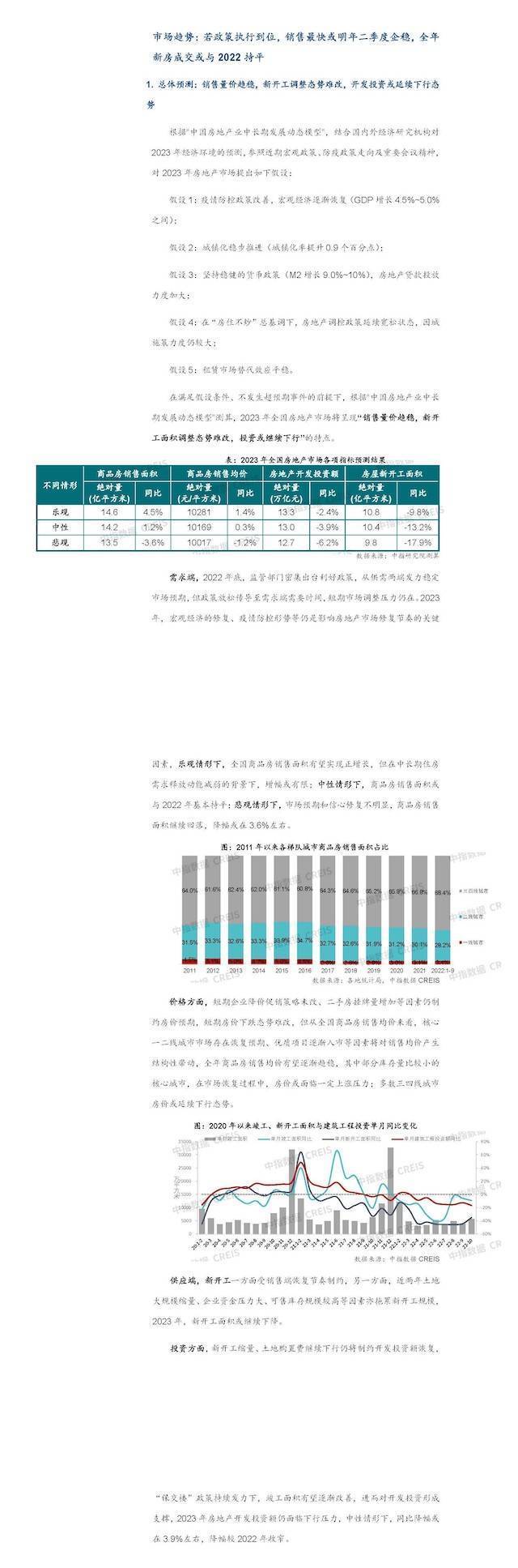 报告称,乐观情形下,全国商品房销售面积有望实现正增长,但在中长期住房需求释放动能减弱的背景下,增幅或有限;中性情形下,商品房销售面积或与2022年基本持平;悲观情形下,市场预期和信心修复不明显,商品房销售面积继续回落,降幅或在3.6%左右。