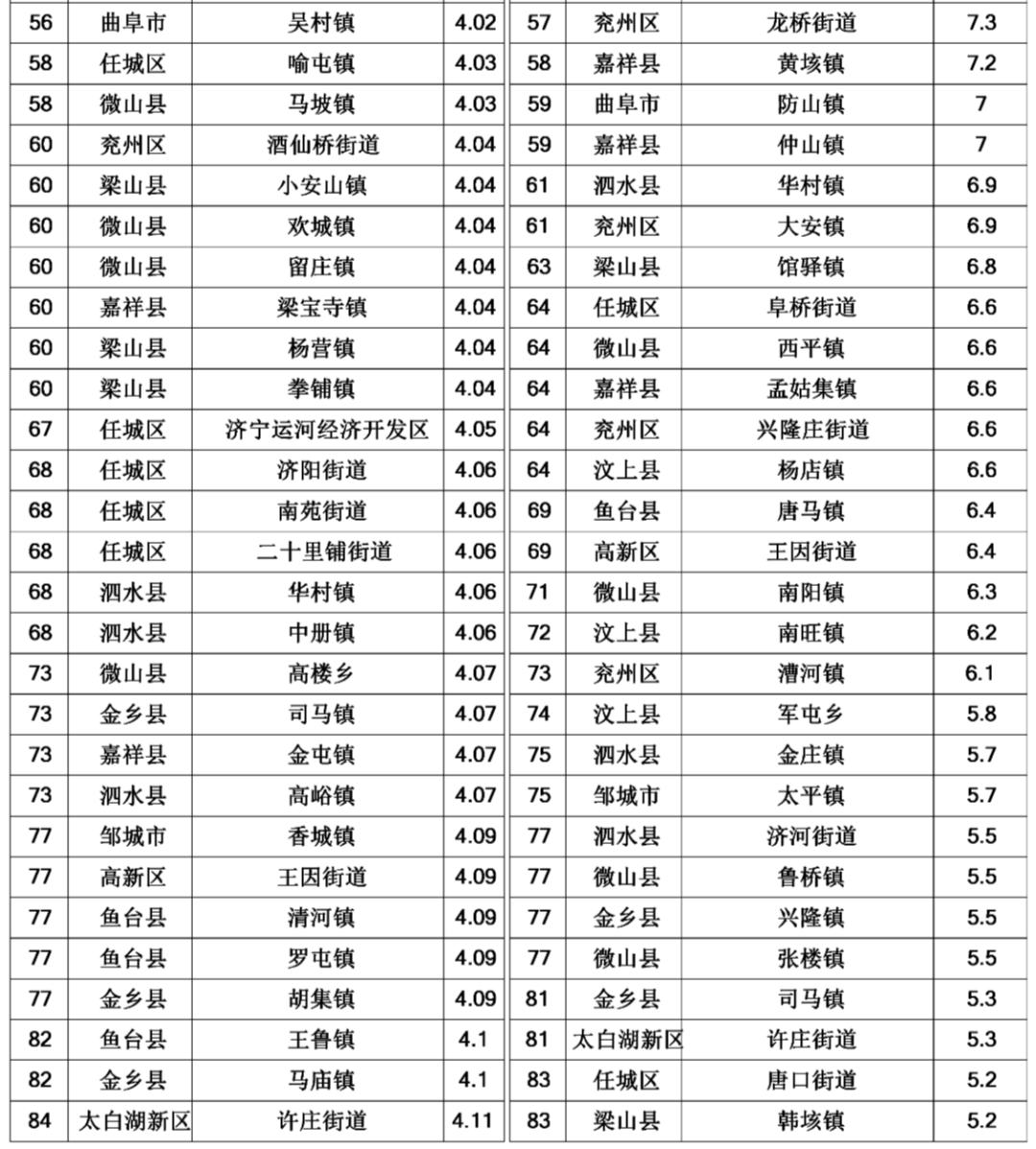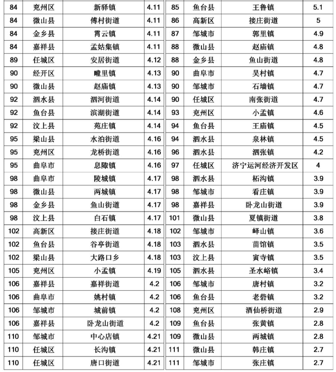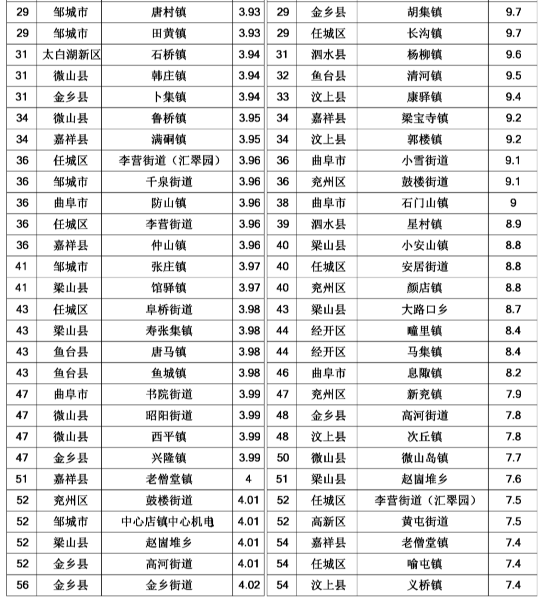 汶上县汶上街道、鱼台县滨湖街道、汶上县中都街道、曲阜市陵城镇、邹城市钢山街道、梁山县梁山街道、邹城市城前镇、金乡县羊山镇、邹城市中心店镇(中心机电)、微山县昭阳街道、嘉祥县嘉祥街道、邹城市千泉街道、微山县傅村街道、鱼台县谷亭街道、泗水县泗河街道、曲阜市书院街道、梁山县水泊街道、微山县高楼乡、金乡县宵云镇、邹城市香城镇。