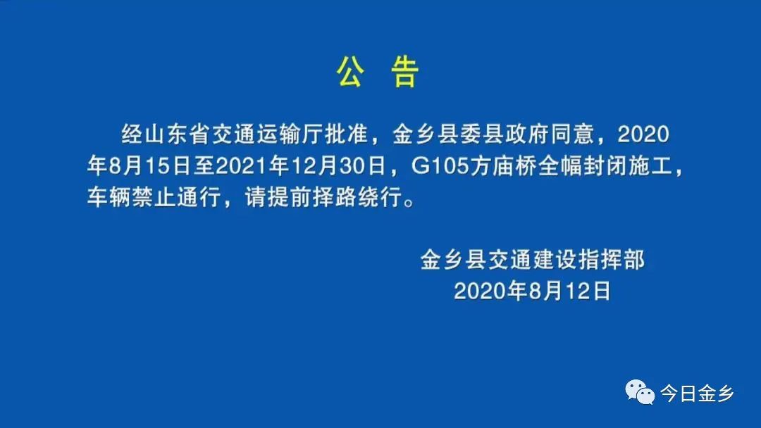 今日金乡发布消息,接上级正式通知,8月15日至2021年12月30日,G105方庙桥全幅封闭施工,车辆禁止通行。