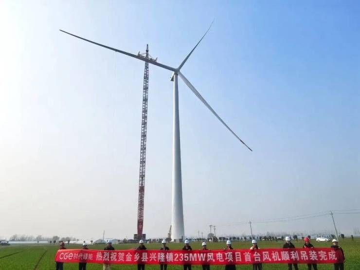 3月11日,时代绿能金乡445MW风电项目首台风机顺利完成吊装,标志着该风电项目正式进入设备全面安装阶段,为后续并网投运奠定了基础。