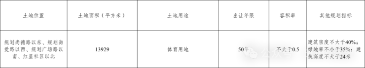 土地位置:规划尚德路以东、规划尚爱路以西、规划广场路以南、红星社区以北;土地面积(平方米):13929㎡;土地用途:体育用地;出让年限:50年;容积率:不大于0.5;其他规划指标:建筑密度不大于40%;绿地率不小于35%;建筑高度不大于24米