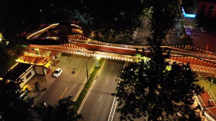 “两座天桥的建设期恰逢酷暑,为保证如期完工,我们加大设备、人员投入,24小时全饱和施工,将钢箱梁安装施工时间安排在夜间完成,使天桥施工对市民生产生活的影响最小化。”专班成员郑义表示。天桥在选址时充分考虑周边通行需求,在为城市增添新景观的同时,还实现了公园、体育场与周边居民区的连接,机动车从桥下快速通行,构建起安全、便捷、通畅、高品质的立体过街系统,使共青团路快速化改造得以实现。两座天桥还同步实施了景观亮化工程,打造出绚丽多彩的夜间效果,也为共青团路的夜晚增加了两道亮丽的风景。