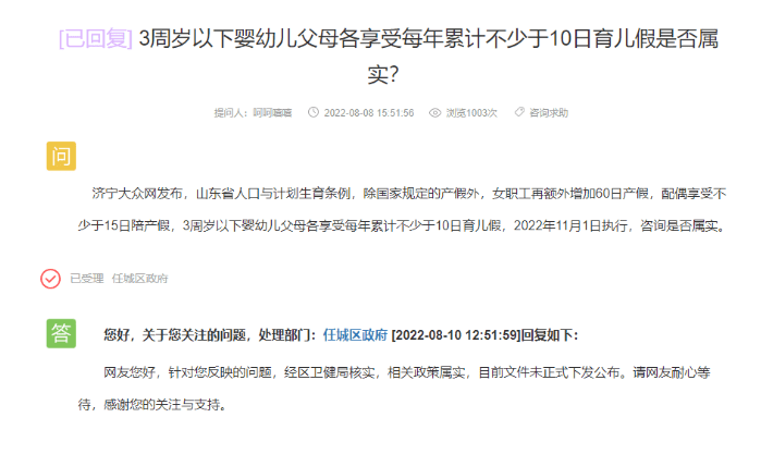 3岁以下婴幼儿父母育儿假济宁何时实施?官方回应来了