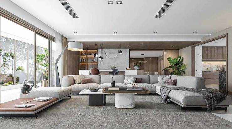 灰咖色真石漆与米白色多彩漆组合,搭配现代艺术线条勾勒出“简约精奢立面”,加上大面宽LOW-E玻璃,使得室内与室外的景观融合最大化。