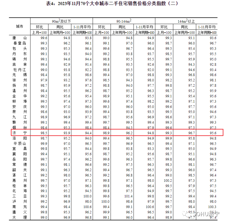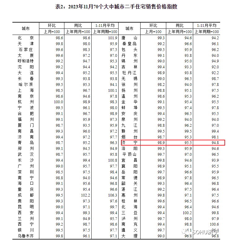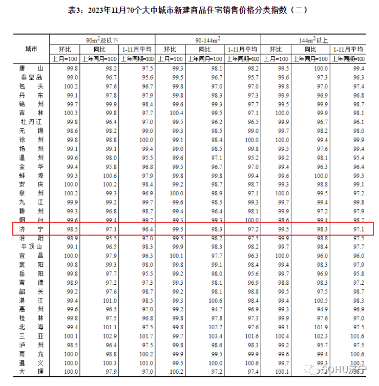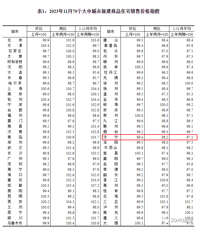 搜狐网济宁小编注意到:今早9点30分,国家统计局发布了2023年11月份70个大中城市商品住宅销售价格变动情况统计数据。2023年11月份济宁新建商品住宅销售价格环比下降0.6个百分点。