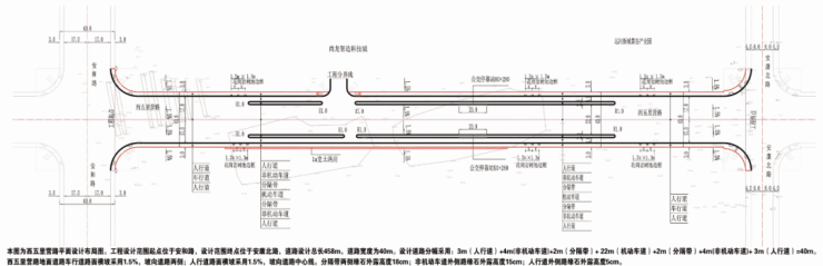 建设规模:西五里营路道路等级为城市次干路,建设用地面积为19569平方米(约29.4亩)。西五里营路建设起点为安和路,终点为安康北路,道路全长458m,道路红线宽40m。