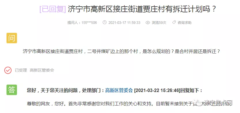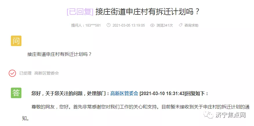 南辛庄宁苑小区近期有拆迁计划吗?请问安置小区有拆迁规划吗?接庄街道申庄村有拆迁计划吗?柳行片区许厂村什么时候会有拆迁规划?博古庄小区五层的老楼有没有拆迁或者改造的计划?疃里镇大王庄村是否有拆迁计划?近日,搜狐新闻·搜狐焦点济宁小编在济宁市网络问政平台上又发现了诸多关于棚改拆迁的问政问题得到了回复,回复情况如下: