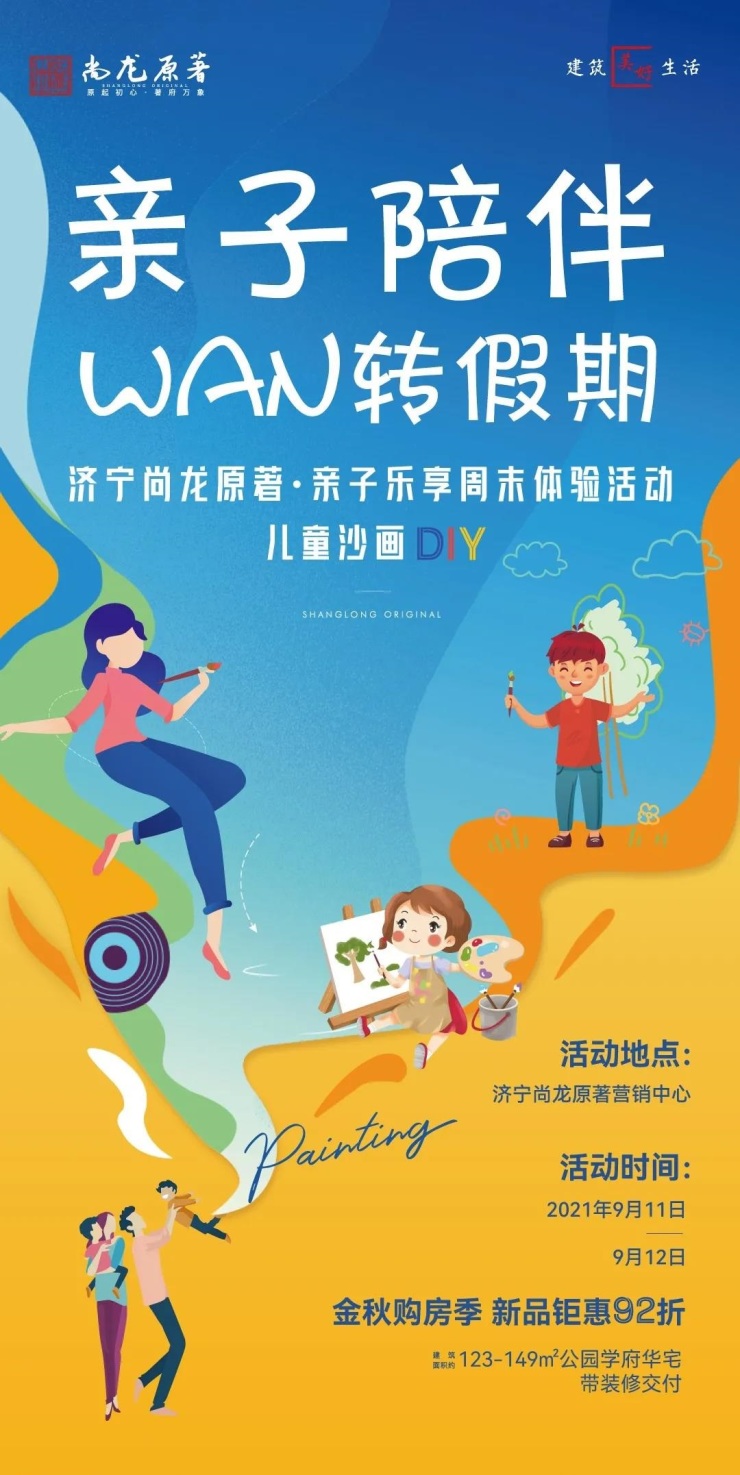 亲子陪伴,WAN转假期。济宁尚龙原著亲子乐享周末体验活动儿童沙画DIY来啦。金秋购房,新品钜惠92折。建筑面积约123-149㎡公园学府华宅,带装修交付。活动地点:济宁尚龙原著营销中心 活动时间:2021年9月11日