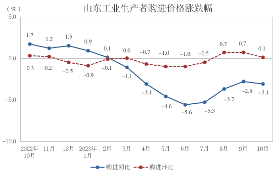2023年10月份,山东工业生产者出厂价格同比下降2.7%,降幅比上月扩大0.2个百分点;环比由上月上涨0.7%转为下降0.2%。购进价格同比下降3.1%,降幅比上月扩大0.3个百分点;环比上涨0.1%,涨幅比上月回落0.6个百分点。1-10月份,工业生产者出厂价格同比下降3.6%,购进价格同比下降2.9%。