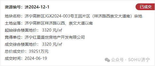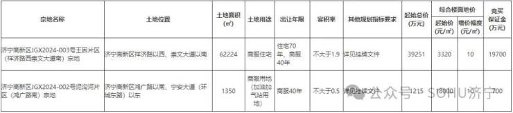 土地位于:济宁高新区祥济路以西、崇文大道以南;土地面积:62224㎡(约93亩);土地用途:商服住宅用地;出让年限:住宅70年、商服40年;容积率不大于1.9;起始价:39251万元,综合楼面价起价:3320元/㎡;最终成交价为:39251万元(约422万元/亩),综合楼面地价成交价:3320元/㎡;溢价率:0.0%;