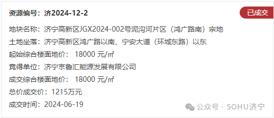 土地位于:济宁高新区鸿广路以南、宁安大道(环城东路)以东;土地面积:1350㎡(约2亩);土地用途:商服用地(加油加气站用地);出让年限:40年;容积率不大于0.5;起始价:1215万元,综合楼面价起价:18000元/㎡;最终成交价为:1215万元(约608万元/亩),综合楼面地价成交价:18000元/㎡;溢价率:0.0%;