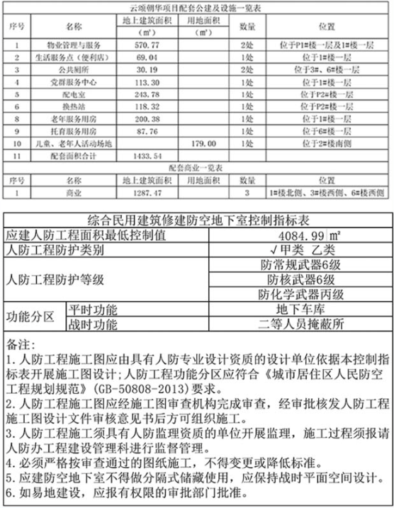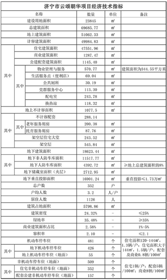 项目规划建设用地面积23845㎡;总建筑面积:69685.77㎡;其中,地上建筑面积:51062.33㎡,计容面积49984.83平方米(含住宅47551.96㎡、商业1287.47㎡、配套1145.40㎡,其中1#住宅17层、含底部一层商业;2#、5#、7#住宅17层:3#住宅10层、含底部一层商业;6#住宅10层、含底部一层商业;8#住宅7层;P1#配套1层;P2#配套1层等)。地下1层,地下建筑面积18623.44㎡。容积率2.10;建筑密度24.32%;绿地率35.48%;计划总居住户(套)数为352户(套),居住人数约1126人(按3.2人/户预算);建筑类型包括住宅、商业、公服配套设施等;规划机动车停车位481个(其中地上车位55个,地下车位426个),非机动车停车位509个。