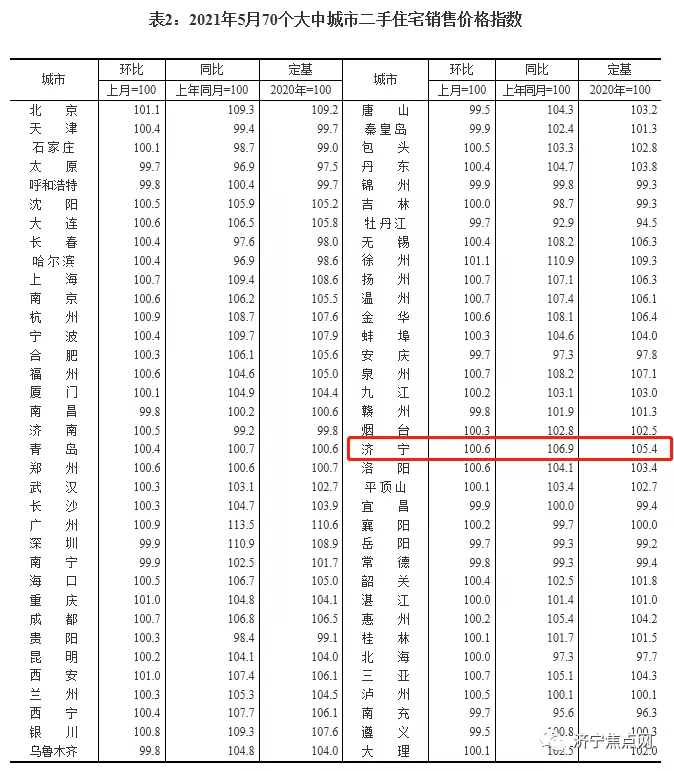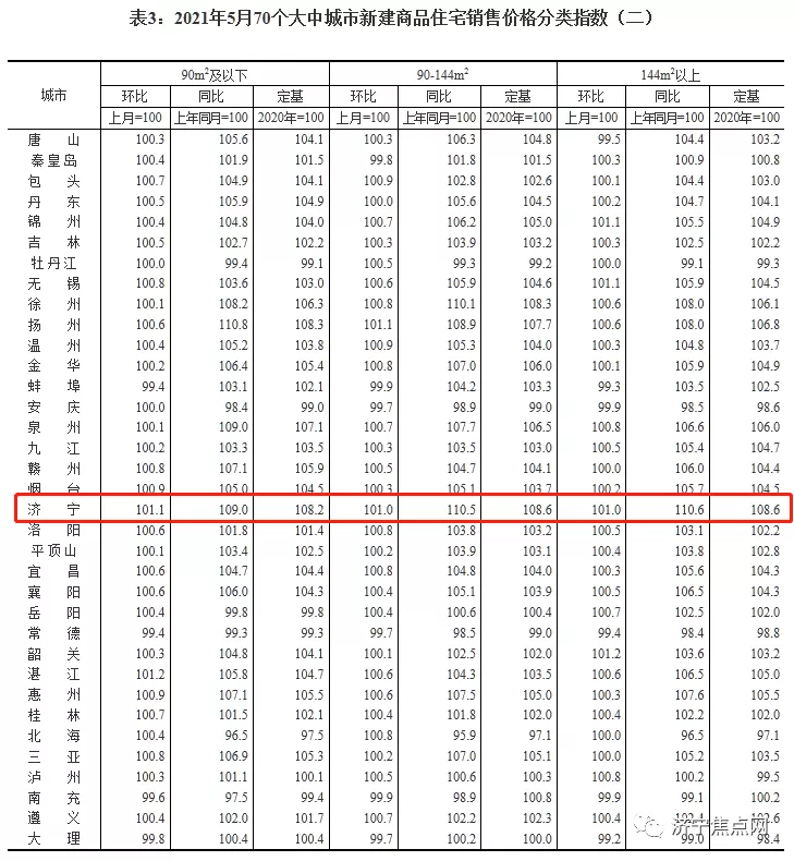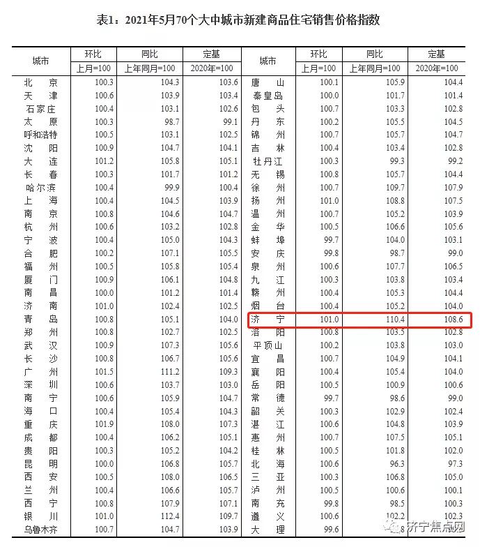 国家统计局今早9点30分发布了2021年5月份70个大中城市商品住宅销售价格变动情况统计数据。2021年5月份济宁新建商品住宅销售价格环比上涨1.0%。