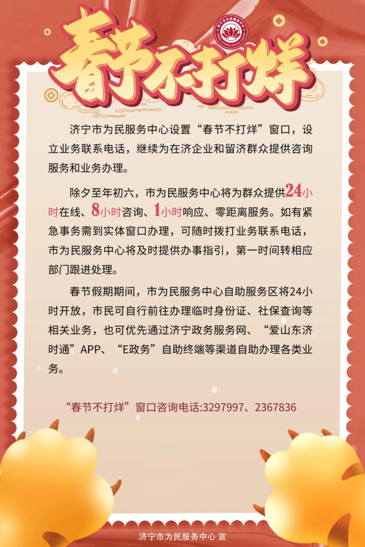 温馨提示:济宁市为民服务中心“春节服务不打烊”
