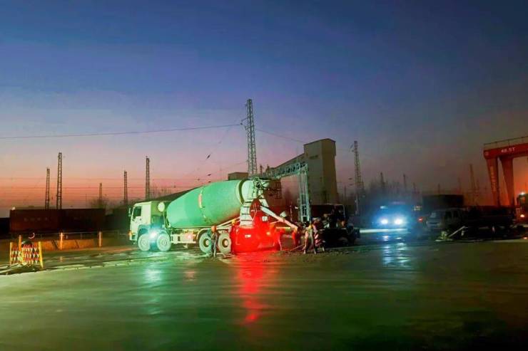 施工过程中,技术团队严格把控混凝土施工关键环节:混凝土采用商品混凝土,按照C40设计配合比精准计量水泥、砂石、水及防冻剂,将拌合用水加热至45℃,控制混凝土出机温度不低于18℃,坍落度保持在150—190mm,确保冬季施工中混凝土和易性达标;浇筑作业前,对基层进行清理、洒水湿润并铺设毛毡预热,避免低温基层吸附混凝土热量导致早期受冻;在摊铺环节创新引入全自动激光找平仪,通过激光信号实时定位高程基准,自动调整混凝土摊铺厚度与平整度,有效将混凝土面层高程误差控制在±3mm内,平整度误差不超过5mm,较传统施工精度提升60%;振捣采用插入式振捣棒+平板振动器组合作业,确保混凝土密实无蜂窝、麻面,初凝前完成表面提浆、收光处理。32小时内,项目部全程动态监测混凝土出机温度、到场温度(不低于15℃)及浇筑进度,每2小时记录一次数据,结合激光找平仪实时反馈调整施工参数,确保混凝土浇筑质量零瑕疵。