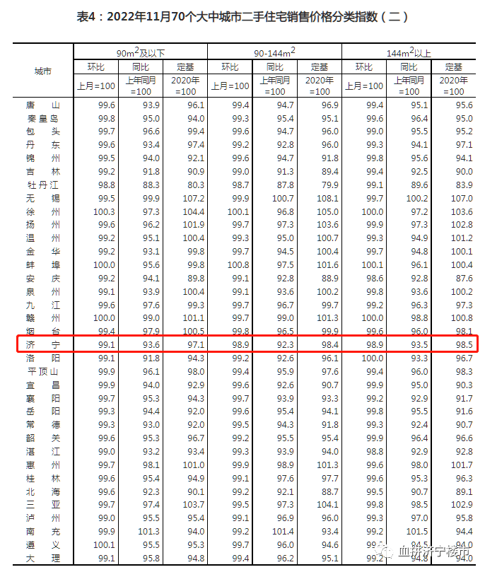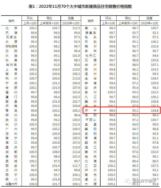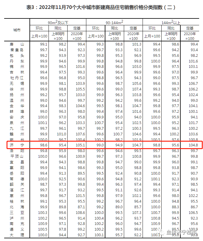 近日,血拼哥注意到:国家统计局发布了2022年11月份70个大中城市商品住宅销售价格变动情况统计数据。2022年11月份济宁新建商品住宅销售价格环比降幅1.1个百分点。