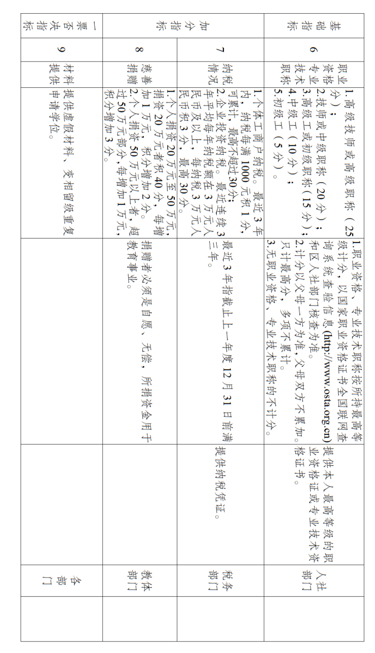 加分指标包含纳税情况、慈善捐赠(用于教育事业)。