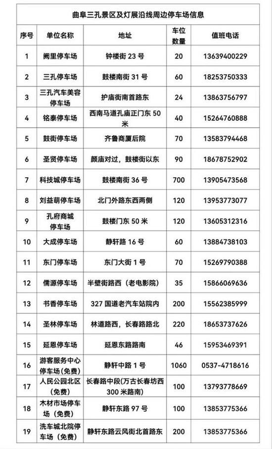 曲阜三孔景区及灯展沿线周边停车场19个,可提供停车位3335个。