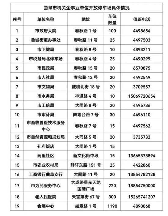 曲阜市机关企事业单位内部停车场免费对外开放19家,可提供停车位2100个(错时开放时间:2月9日17:30—2月18日8:00;2月18日—2月25日每日17:30—次日8:00)。