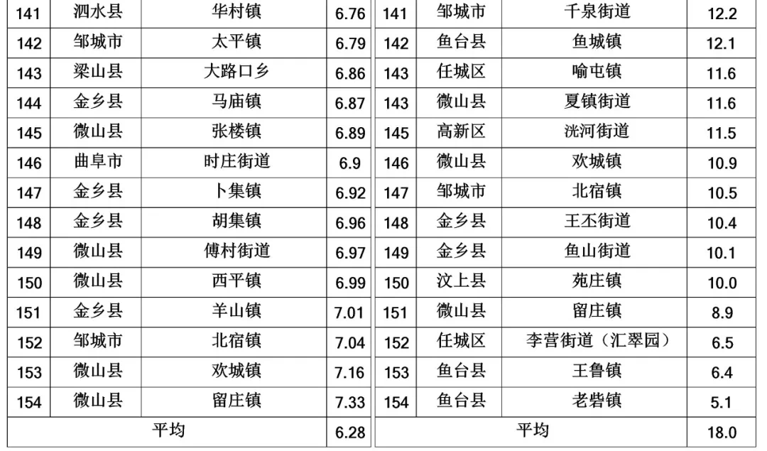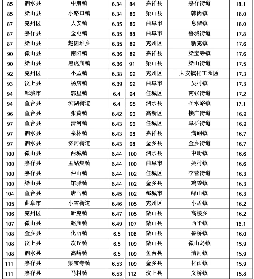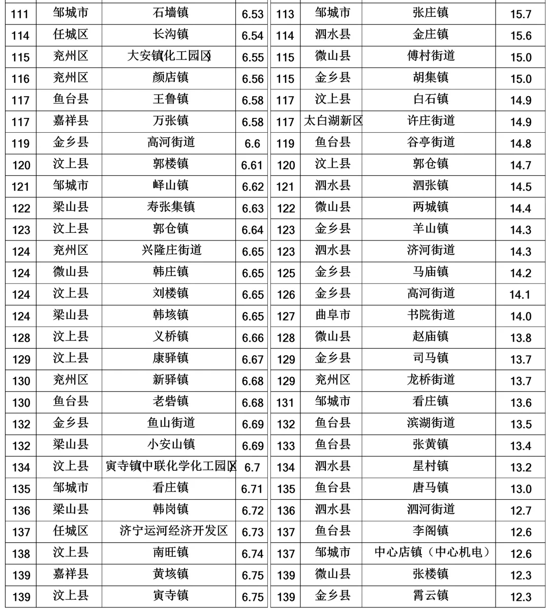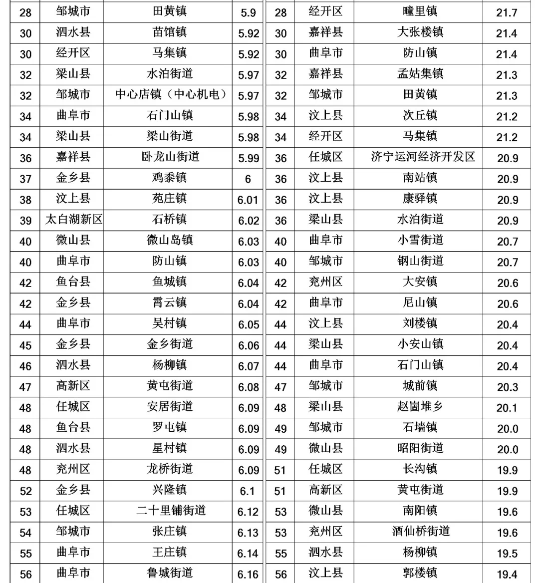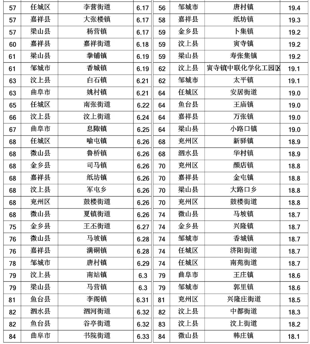 微山县留庄镇、微山县欢城镇、邹城市北宿镇、金乡县羊山镇、微山县西平镇、微山县傅村街道、金乡县胡集镇、金乡县卜集镇、曲阜市时庄街道、微山县张楼镇、金乡县马庙镇、梁山县大路口乡、邹城市太平镇、泗水县华村镇、汶上县寅寺镇、嘉祥县黄垓镇、汶上县南旺镇、任城区济宁运河经济开发区、梁山县韩岗镇、邹城市看庄镇。
