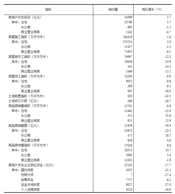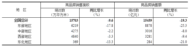 1—2月份,商品房销售面积15703万平方米,同比下降9.6%,其中,住宅销售面积下降13.8%;商品房销售额15459亿元,下降19.3%,其中,住宅销售额下降22.1%。
