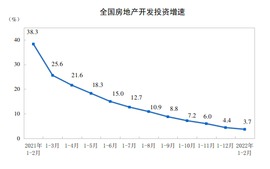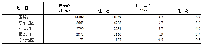 1—2月份,全国房地产开发投资14499亿元,同比增长3.7%;其中,住宅投资10769亿元,增长3.7%。