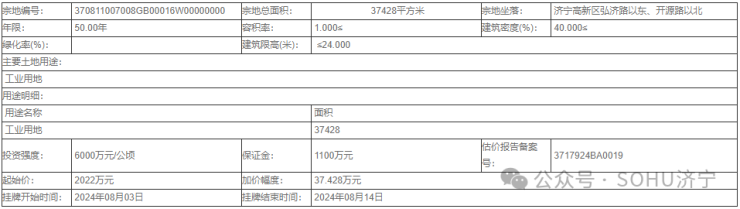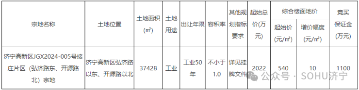 土地位于:济宁高新区弘济路以东、开源路以北;土地面积:37428㎡(约56亩);土地用途:工业用地;出让年限:50年;容积率不小于1.0;起始价:2022万元,综合楼面价起价:540元/㎡;