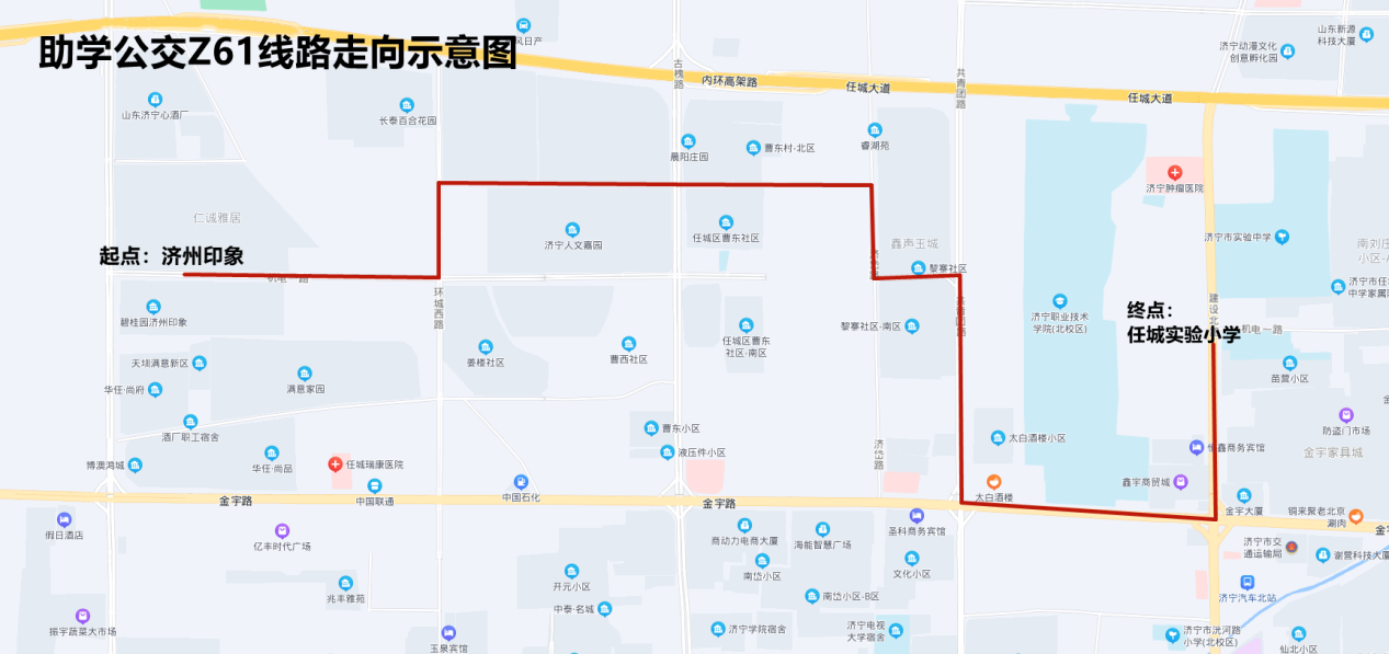 Z61:从机电一路“仁诚雅居”公交站点发车,沿机电一路向东至环城西路,沿环城西路向北至机电二路,沿机电二路向东至济岱路,沿济岱路向南至机电东路,沿机电东路向东至共青团路,沿共青团路向南至金宇路,沿金宇路向东至建设路,沿建设路向北至终点站任城实验小学。途经7个站点:济州印象、机电一路西段(仁诚雅居)、机电二路环城西路、机电二路古槐路、机电东路共青团路、京华眼科医院、任城实验小学。配车1辆,运营早、中、晚4个班次。