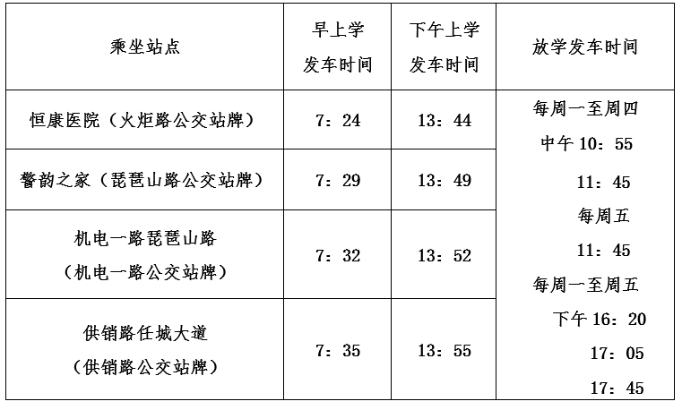 7、针对恶劣天气时不具备安全通行条件下可能采取的调整发车时间或者暂时停运措施,请家长在接到学校通知后提前安排好出行方式。