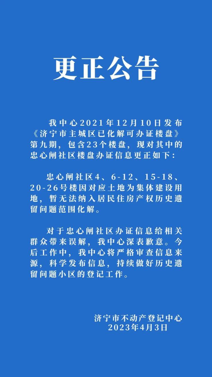 济宁市不动产登记中心2021年12月10日发布《济宁市主城区已化解可办证楼盘》第九期,包含23个楼盘,现对其中的忠心闸社区楼盘办证信息更正如下 :