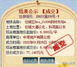 土地位于:任城大道以北、科苑路以东;土地面积:58445㎡(约88亩);土地用途:商住用地;出让年限:商业40年、住宅70年;容积率不大于2.0;起始价:77148万元,综合楼面价起价:6600元/㎡;交付条件为净地;最终成交价为:77148万元(约877万元/亩),综合楼面地价成交价:6600元/㎡;溢价率:0.0%;