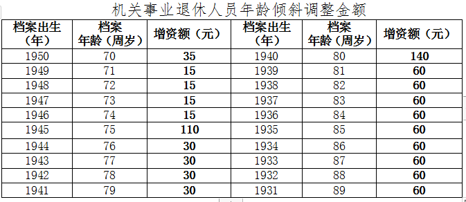 主要是适当提高高龄退休人员的调整水平,对达到70岁以上的高龄退休人员,在定额调整和挂钩调整的基础上,再多增加一定数额的养老金。一方面:2020年12月31日前年满70周岁不满75周岁(以办理退休手续时按规定确认的出生年月计算,下同)、年满75周岁不满80周岁和年满80周岁以上的退休人员,每人每月分别增加15元、30元和60元养老金。另一方面:综合考虑不同年龄、不同情况人员以往年度倾斜标准等因素,对达到相应年龄的有关人员,再适当增加一定数额的养老金,具体标准是:对2020年1月1日至12月31日期间达到70、75和80周岁的退休人员,正常企业退休人员每人每月分别增加290元、190元和360元;企业一次性补缴参保人员每人每月分别增加70元、60元和120元;机关事业单位退休人员每人每月分别增加20元、80元和80元。