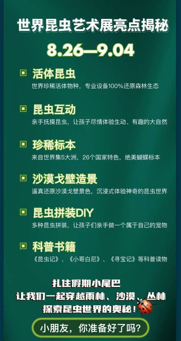 它们来自世界各地5大洲、26个国家,瑰丽的蝴蝶翅膀。一定能让你大饱眼福,感叹大自然的造物之美。如果你恰好热爱绘画或手工,或许,还能从中汲取不菲的灵感!来博观·江悦,抓住假期小尾巴,让我们一起穿越雨林、沙漠、丛林,探索昆虫世界的奥秘!