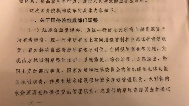 另外,国家发改委的组织编制主体功能区规划职责,住建部的城乡规划管理职责,水利部的水资源调查和确权登记管理职责,原农业部的草原资源调查和确权登记管理职责,国家林业局的森林、湿地等资源调查和确权登记管理职责,国家海洋局的职责,国家测绘地理信息局的职责,将整合划归自然资源部。