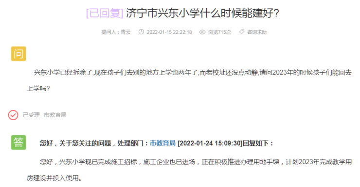 近日,搜狐网·搜狐焦点济宁小编在济宁市网络问政平台上注意到有网友提问:兴东小学已经拆除了,现在孩子们去别的地方上学也两年了,而老校址还没点动静,请问2023年的时候孩子们能回去上学吗?