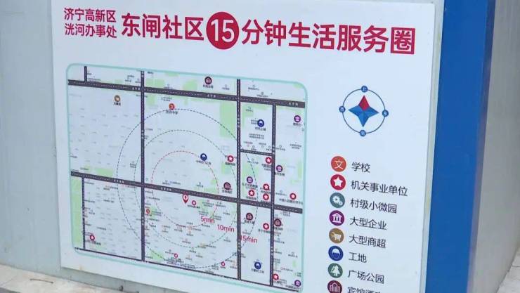 在洸河街道东闸社区的显眼位置有一张地图,详细标记了从小区出发15分钟内能够抵达的各类商业网点,银行、学校、超市、广场等一应俱全,标注清晰明了,为居民的日常生活带来了极大便利。