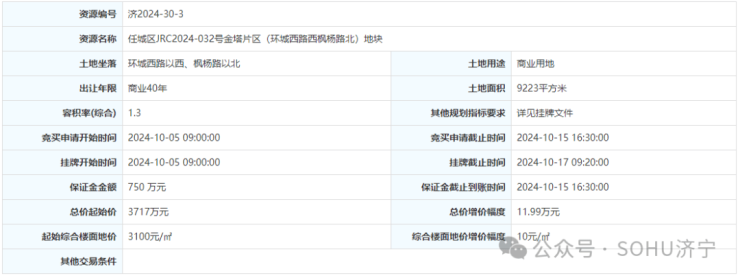 3. 任城区JRC2024-032号金塔片区(环城西路西枫杨路北)地块:2024年10月5日9时00分至2024年10月17日9时20分;