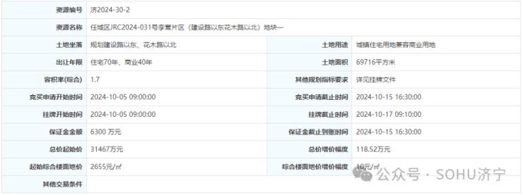 2. 任城区JRC2024-031号李营片区(建设路以东花木路以北)地块一:2024年10月5日9时00分至2024年10月17日9时10分;