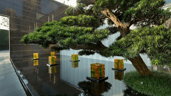 夏至,树荫成伞,为树下摇扇纳凉的人们撑起一片清凉。水润静庭流水潺潺,与几声蝉鸣应和,跌水涌泉,鹤影跃然,曲径通幽,闲庭幽坐,于此处当轩对弈,观天地,观内心,万物静观皆自在,颇有意趣。
