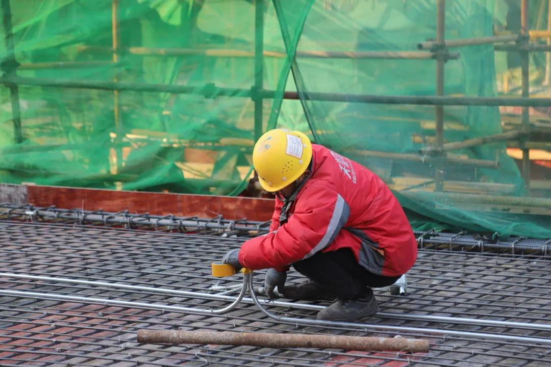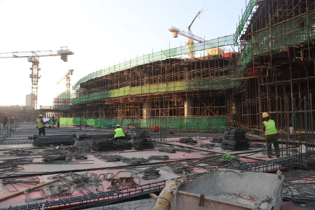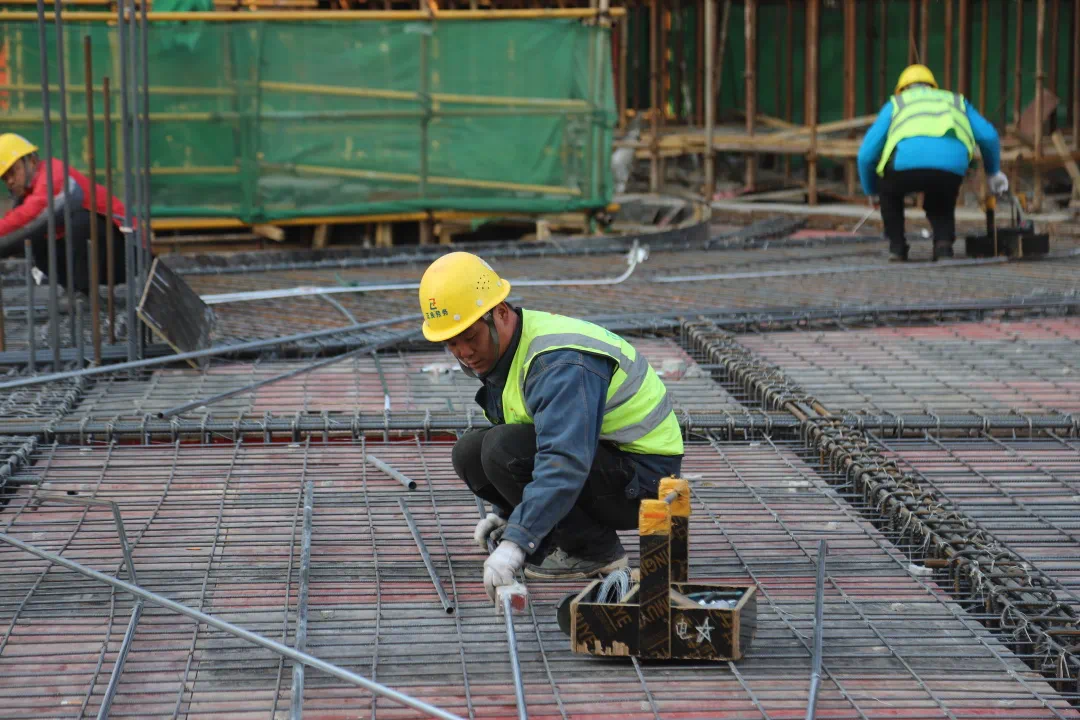 在项目现场,吊车正在来回吊运钢筋等建筑材料,各个作业面上的工人正在开展支模、绑扎钢筋等施工。