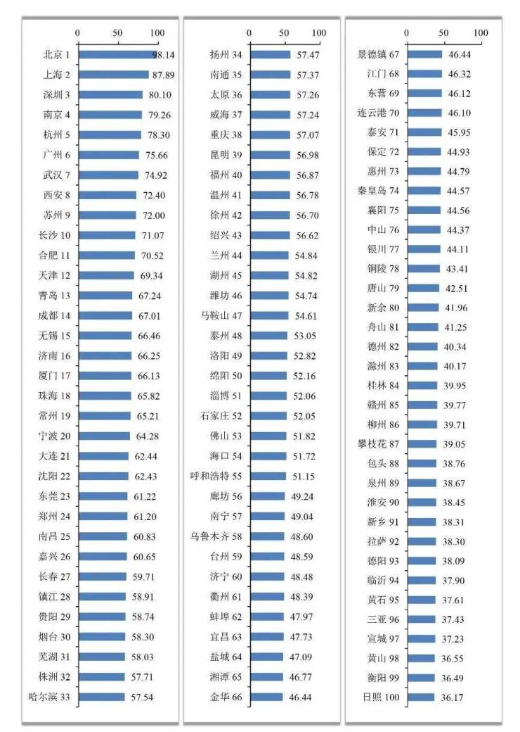 报告还提到,在103个国家创新型城市(区)中,有15个创新资源较为匮乏的城市不在百强榜之列,这些城市多处在欠发达地区。“越是欠发达地区,越需要实施创新驱动发展战略”,报告编写组认为,这些城市需要通过“东西联动”“南北互动”等举措增加科技创新力量。