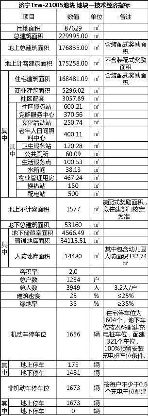 项目规划建设用地面积8.7629公顷(约131亩);总建筑面积:229995㎡;其中地上建筑面积为176835㎡、地下建筑面积为53160㎡;容积率为2.0;建筑密度25%;绿地率35%;计划总居住户(套)数为1234户(套),居住人数约3949人(按3.2人/户预算);建筑类型包括住宅、商业、公共配套设施等;规划机动车停车位1656个,非机动车位1673个。