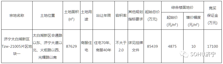 土地位于:太白湖新区会通路以东、济宁大道以北、火炬路以西、光耀路以南;土地面积:87629㎡(约18.25亩);土地用途:商住用地;出让年限:住宅70年,商业40年;容积率不大于2.0;起始价:85439万元,综合楼面价起价:4875元/㎡;