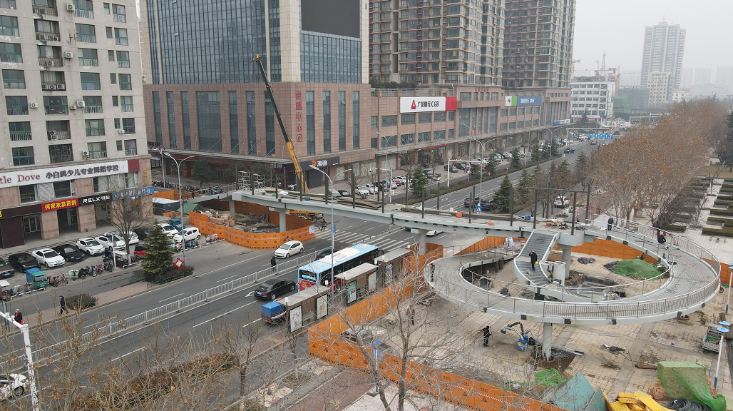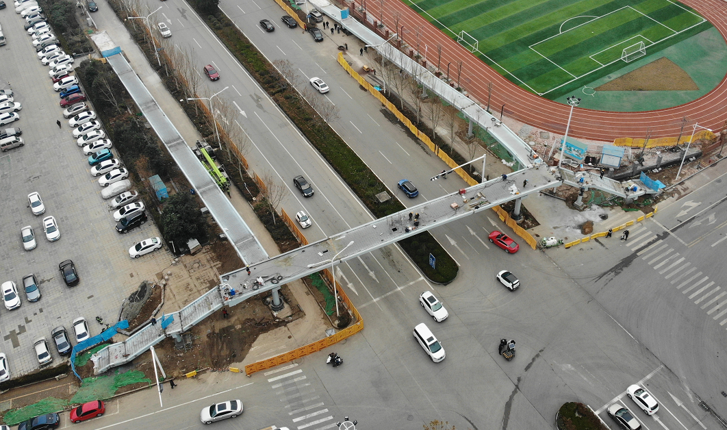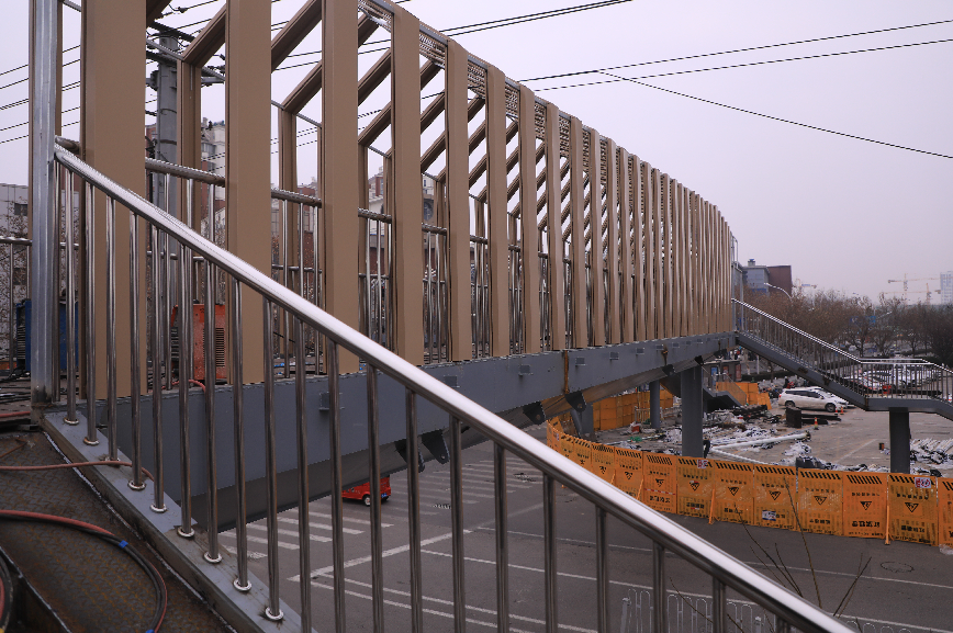 目前该天桥已完成桥梁主体施工,正在进行桥面铺装、护栏安装、雨棚搭设等工作,计划1月20日前完工通行。