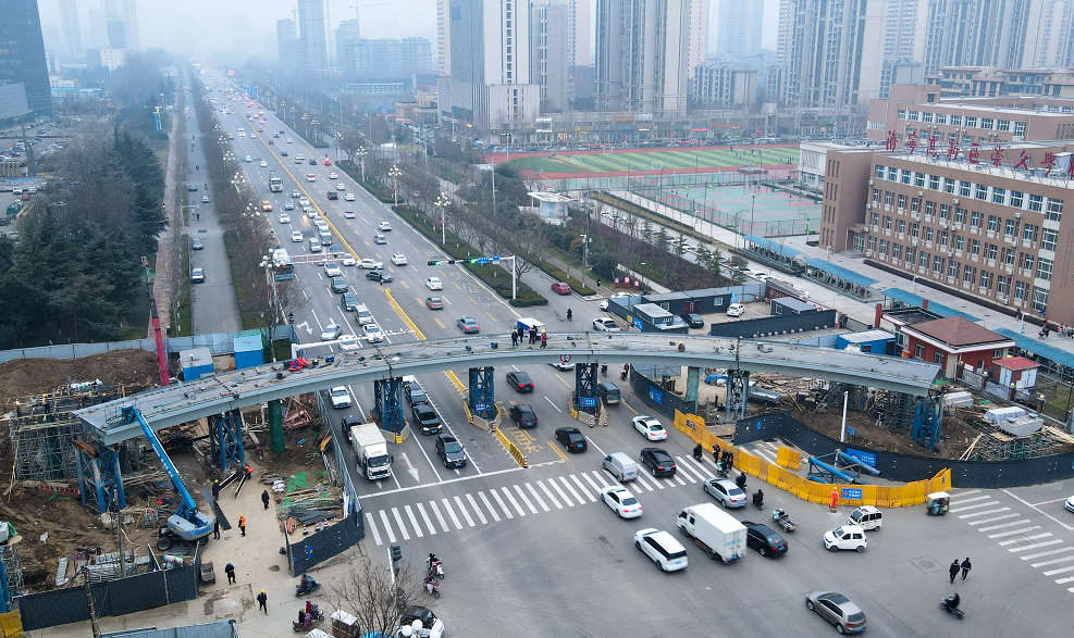 在新世纪广场西侧,两道圆月般的天桥通道吸引了不少市民的目光。正在此处建造的东红庙路人行天桥横跨琵琶山路,连接了东红庙路与新世纪广场,为合理利用空间,方便非机动车和行人出行,该项目专门将一侧的连续钢板梁坡道和梯道设计为圆弧形,造型优美。