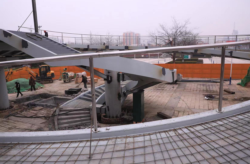 目前,该项目钢箱主梁、坡道、梯道全部安装完成。正进行剪力钉焊接和钢筋绑扎,预计1月20日对外开放。
