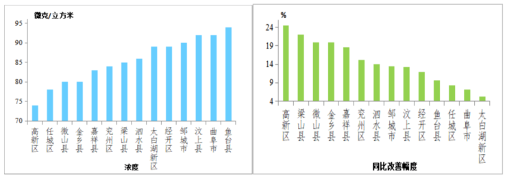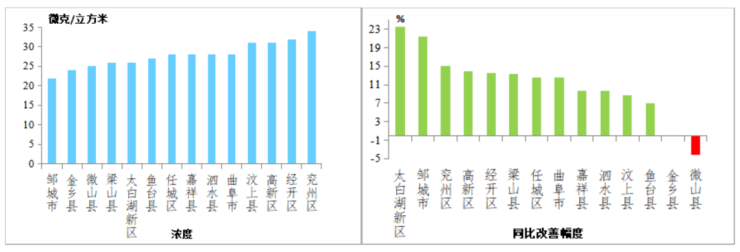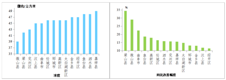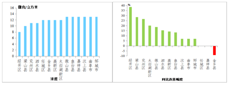 细颗粒物(PM2.5)浓度较低的县(市、区)是微山县,为39微克/立方米;较高的是嘉祥县,为49微克/立方米;14县(市、区)同比改善幅度较大的是梁山县,改善幅度为34.4%,最小的是经开区,为11.3%。
